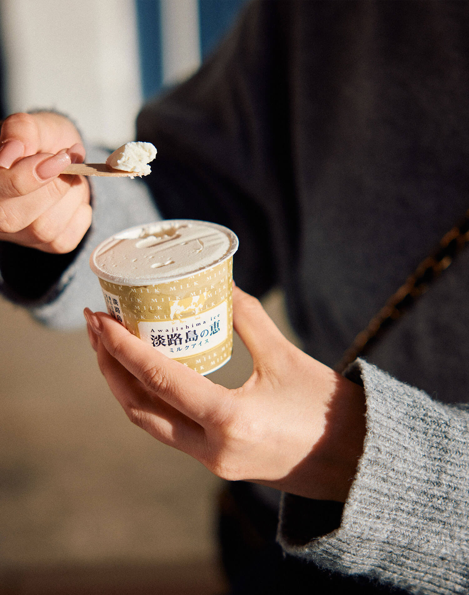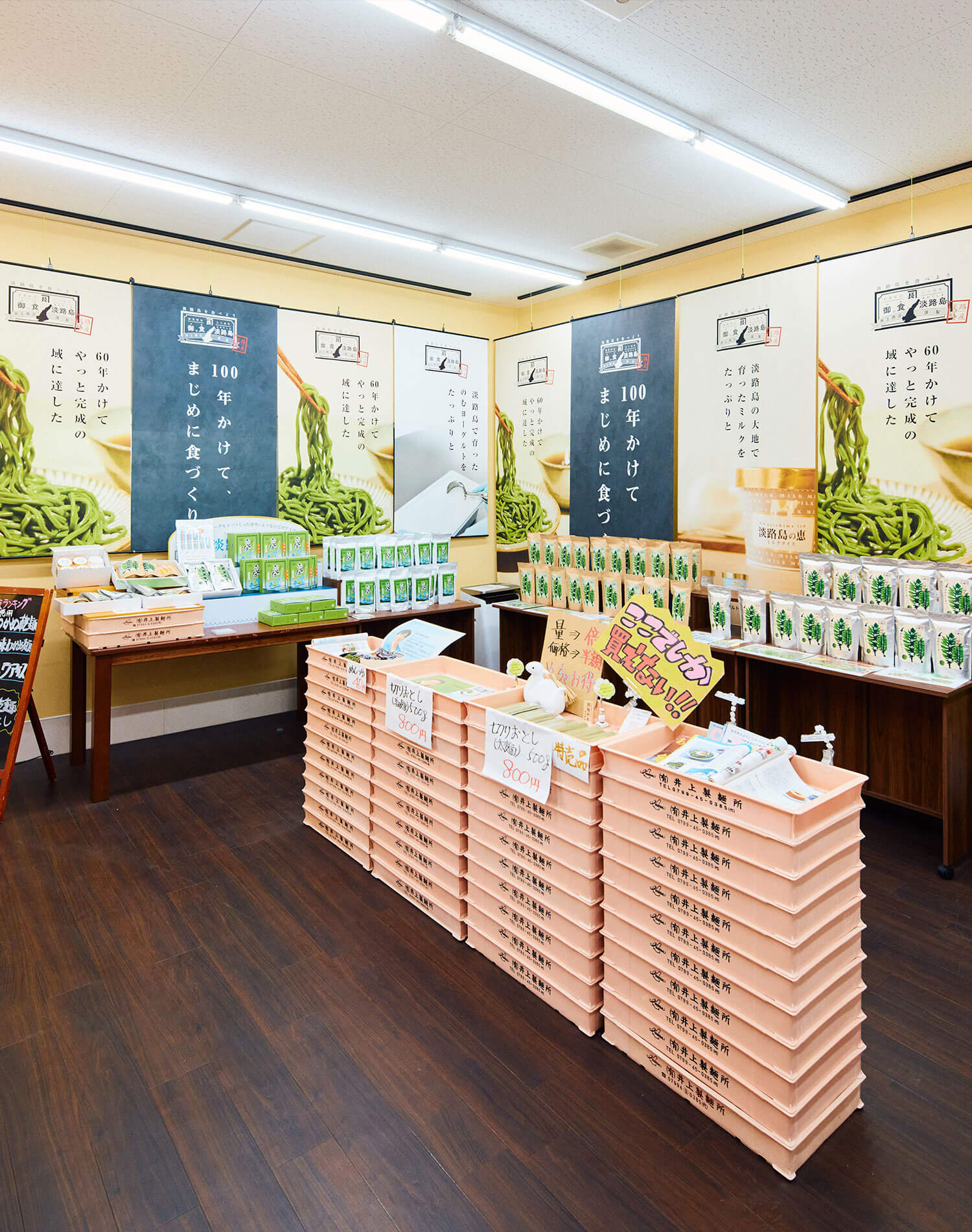 淡路島の中南部に位置する南あわじ市の市街地で、明治34年より製麺業を営んできた『井上商店』。門外不出の秘法で作られる〈わかめ麺〉や、麺類に続く主幹商品〈淡路島の恵アイス〉など、島外ではなかなか出会うことが難しい、まさにローカルフードを生産し続ける老舗メーカーです。ここはそんな同社の歴史が根付いた、工場兼オフィス兼販売店。特に自社商品を扱う販売スペースは飾らない地元商店といった風体ながら、情報通の観光客も足を運ぶ隠れ人気スポット。いわゆるメジャーなお土産品とは一線を画す、ここでしか出会えない逸品を。
