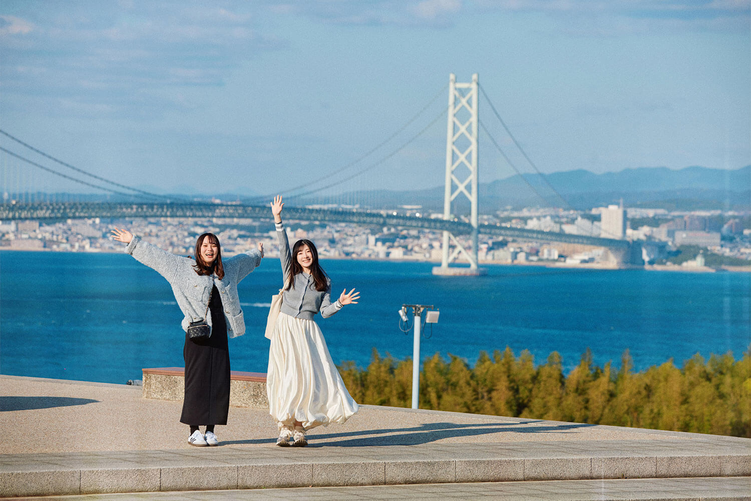 淡路サービスエリア(上り)の展望スポット『橋の見える丘』は、明石海峡大橋と大阪湾を一望できる、淡路島を代表するビューポイント。海と空のコントラストの中、世界最大級の吊り橋でもある明石海峡大橋のスケールが感じられる絶景は、息を呑むこと必至。女子2人も快晴の空と青い海に見惚れながら、しばしその贅沢な時間を堪能。また夜間にはライトアップが行われ、昼とはまったく違う幻想的な雰囲気に包まれるそう。時間帯によって表情が変わる、淡路島屈指の絶景スポットとして覚えておきたい場所です。