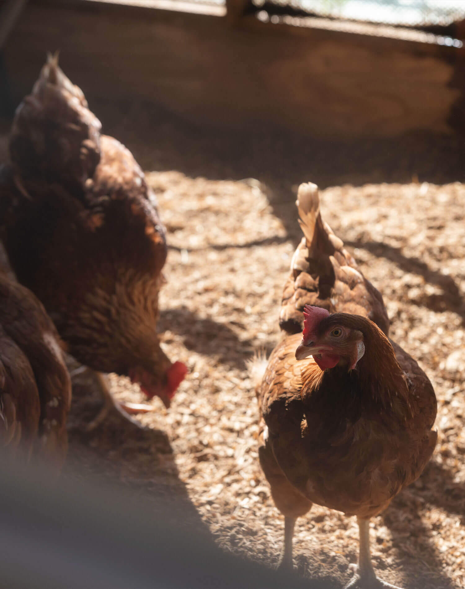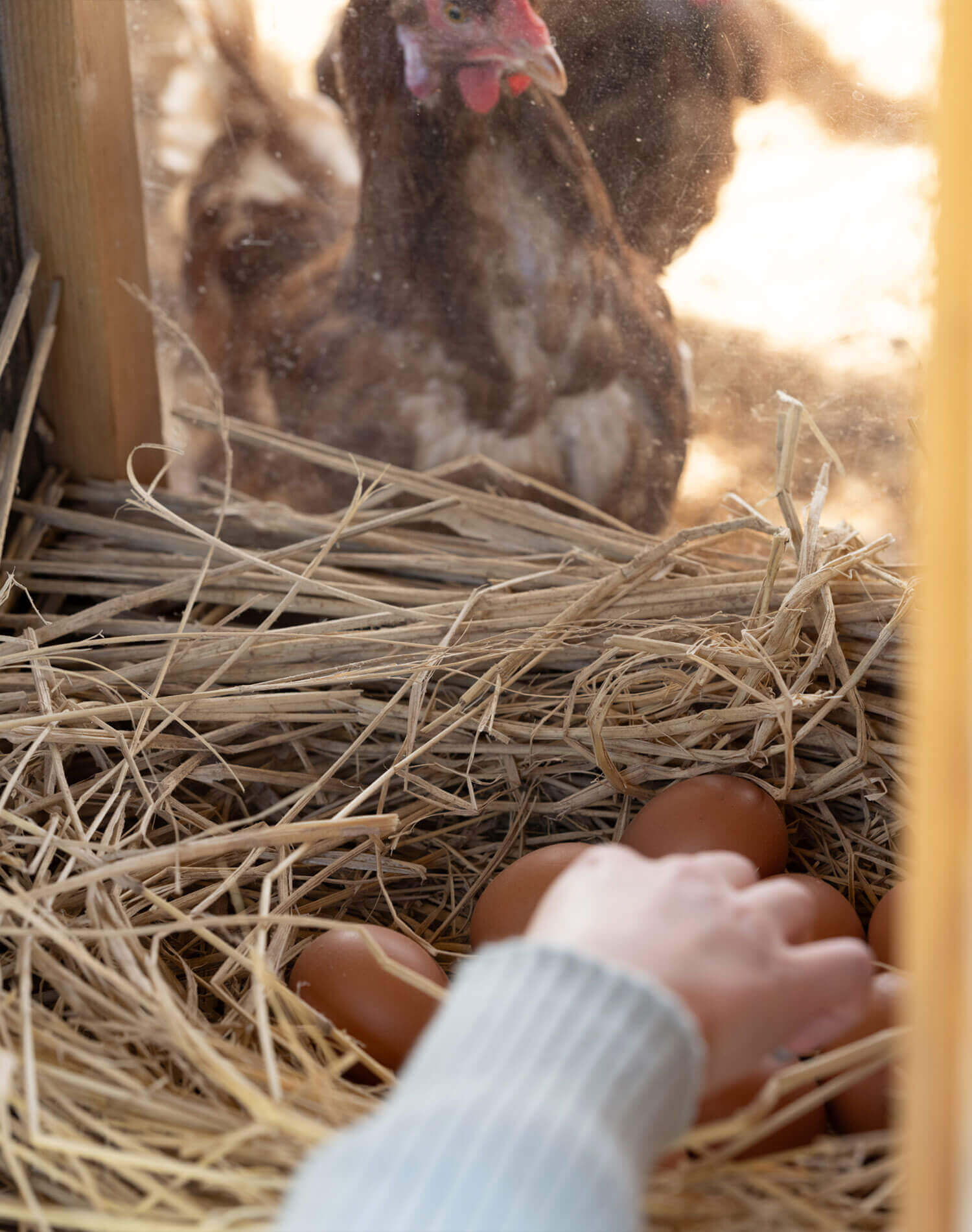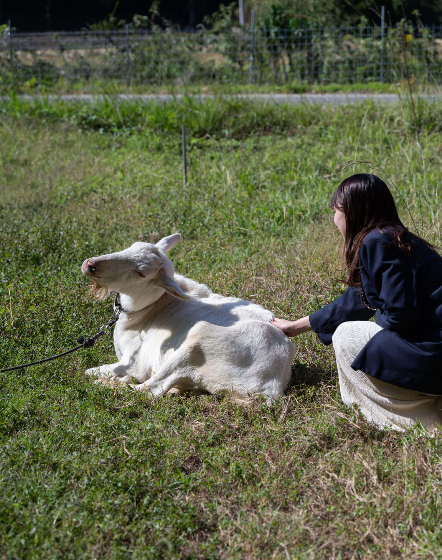 直売所のすぐそばには、実際に鶏たちが暮らす平飼いの鶏舎があり、その様子を間近で見学することも。タイミングが良ければ、産み落とされたばかりの卵をその場で採取させてもらえるかも。また直売所の裏手では、看板“羊”のくるめくんがのんびり過ごしています。つい近寄りたくなる愛らしさがありますが、気まぐれに頭突きをしてくることもあるので要注意。HESTA大倉の広報担当・井下さんも、おっかなびっくりタッチに成功。なんとか頭突かれずに済みました。
