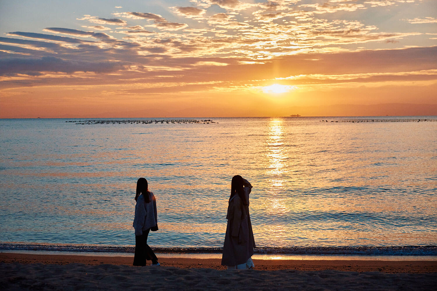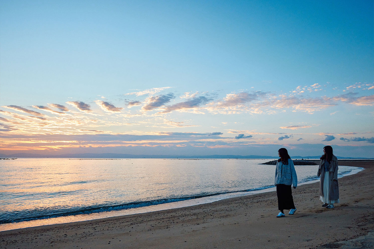 最後は、淡路島の東側に位置する『浦県民サンビーチ』。“日本の海水浴場88選”にも認定されたこの美しい砂浜は、水平線からゆっくりと太陽が昇る日の出のスポットとしても有名だとか。というわけで撮影チームも、早朝のサンライズハントへ。あいにく海から太陽が顔を出す瞬間は拝めませんでしたが、雲の隙間からこぼれた光が、空と海を少しずつ色づけていく美しい朝焼けをGET。静かな浜辺を歩きながら、その変わりゆく景色を眺める時間は、旅のエンディングを飾るのにふさわしい1シーンに。淡路島らしい穏やかな朝の絶景は、一見の価値ありです。