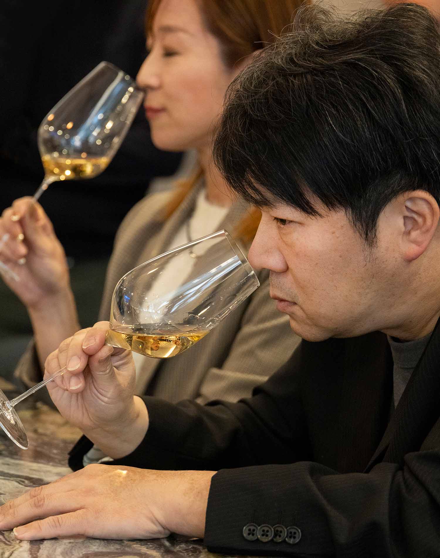 同席したソムリエの紙谷さんも、真剣な面持ちで吟味するようにテイスティング。フェアでの使用シーンを想定し、料理との相性もシミュレーションしながら、香りの立ち方や余韻の残り方まで細かくチェックします。