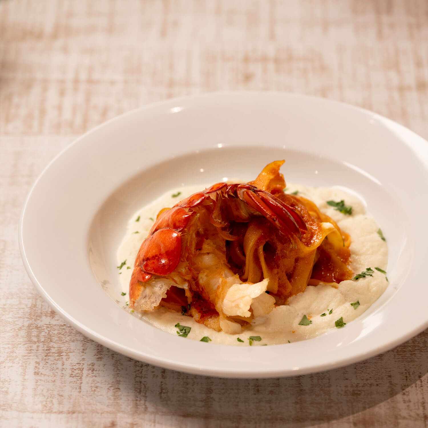 「特殊な瞬間冷凍技術による、鮮度抜群の上質なオマール海老の尻尾を贅沢に使用。エビの赤、ソースの白、パセリの緑でクリスマスカラーを意識しました」