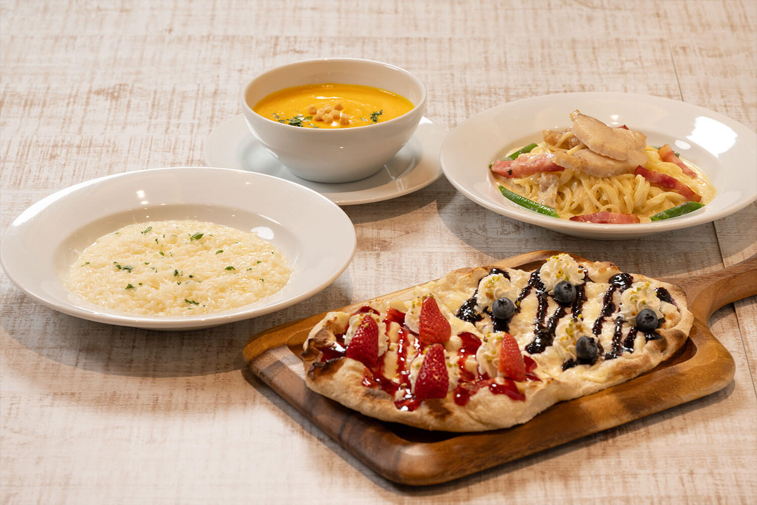 また同店では、11月からグランドメニューにも冬季限定のお料理が仲間入り。看板メニューをスイーツへと様変わりさせた〈フルーツピンサ〉や、〈ニンジンとかぼちゃのポタージュ〉、〈タラとベーコンとグリーンアスパラのクリームパスタ〉、5種のチーズを贅沢に使った〈チーズリゾット〉など、心も体も温まるラインナップは必食。〈ホットワイン〉、〈ホワイトミモザ〉、〈ビターチョコラータ〉などの冬限定ドリンク類もオススメです。