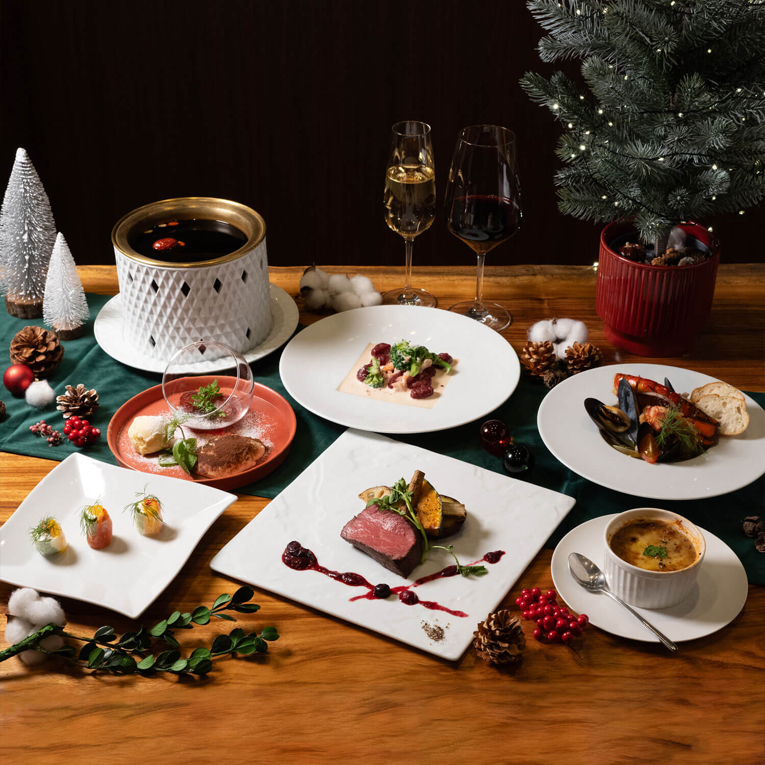 落ち着いた雰囲気の中で、心からのくつろぎを楽しんでもらえる空間を目指して。次のブロックでは、その特別な日を飾るクリスマスディナーの全体像をご紹介します。