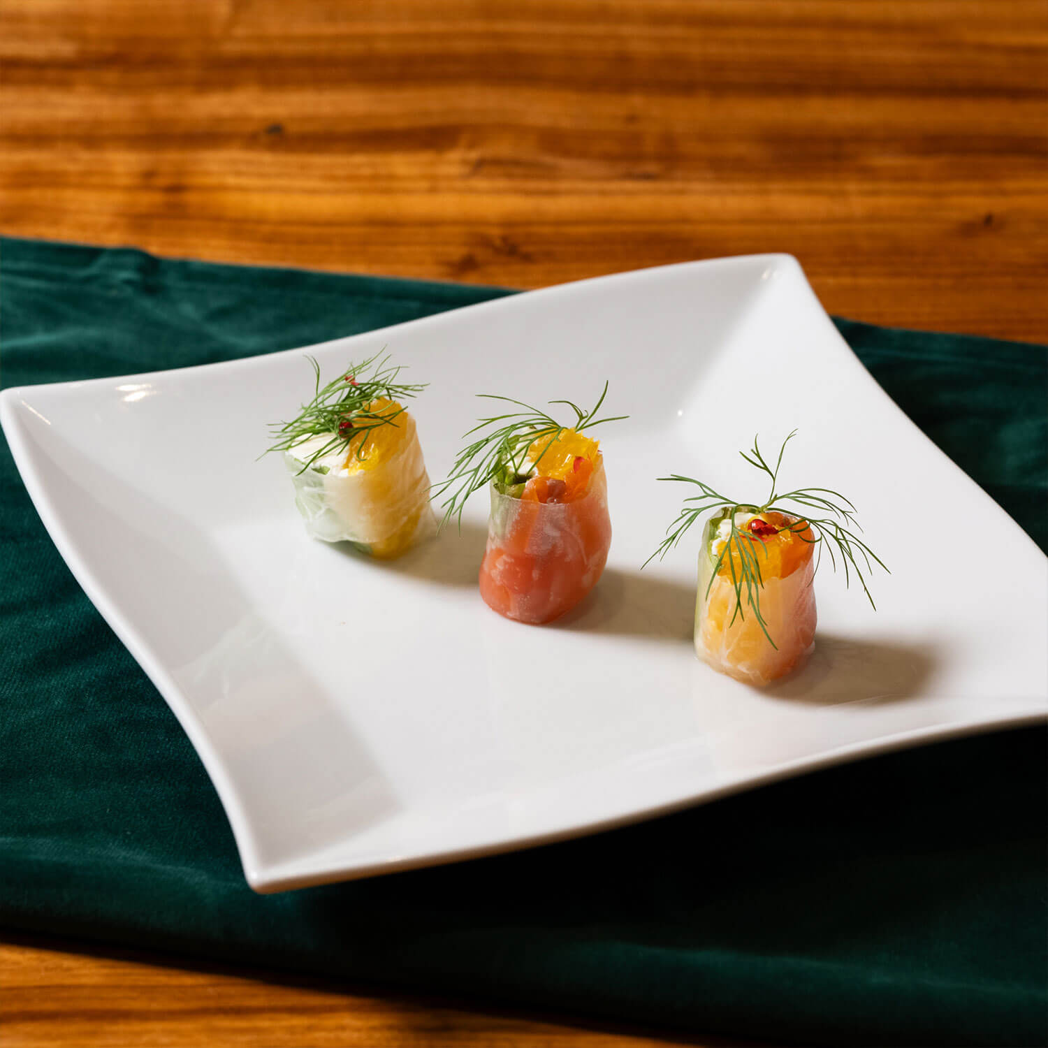 香ばしいスモークサーモン、濃厚なクリームチーズ、フレッシュなオレンジ。異なる味わいと食感をライスペーパーで包み込んだ、見た目も爽やかな前菜。