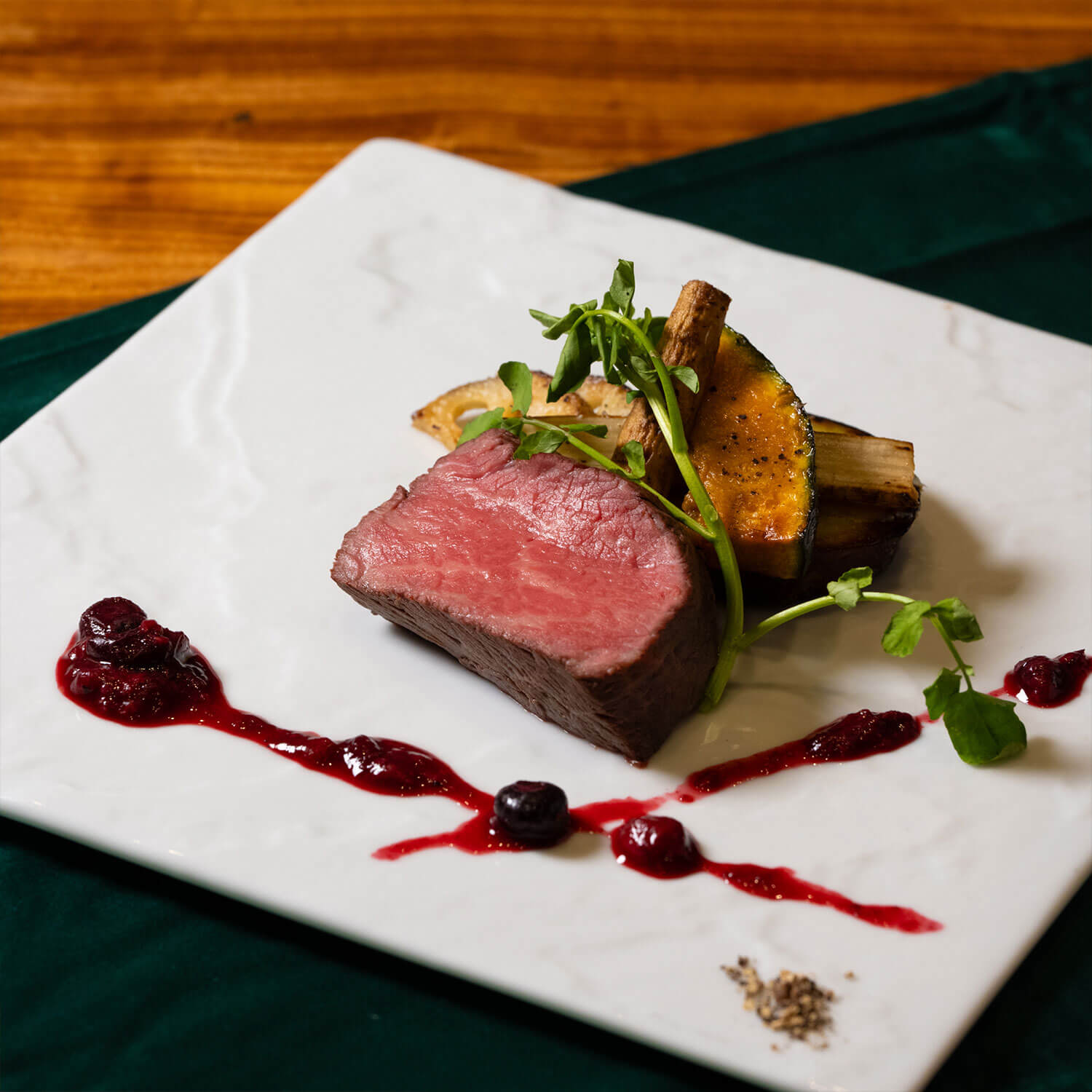 柔らかくきめ細かな肉質が特徴の自社ブランド牛〈近江大倉和牛〉のフィレ肉を、しっとりと焼き上げたひと皿。柔らかな酸味と甘味が絡みあうベリー系ソースが、肉の旨味を引き立てます。