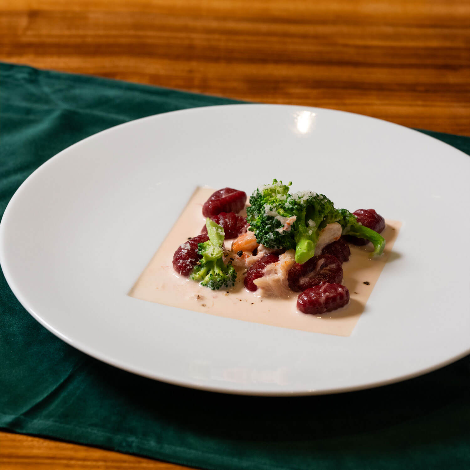 ビーツを生地に練り込んだ赤いニョッキに、ズワイガニの旨味を溶け込ませたクリームソースを合わせて。まろやかな味わいの中に彩りを添える、ブロッコリーの食感がアクセント。