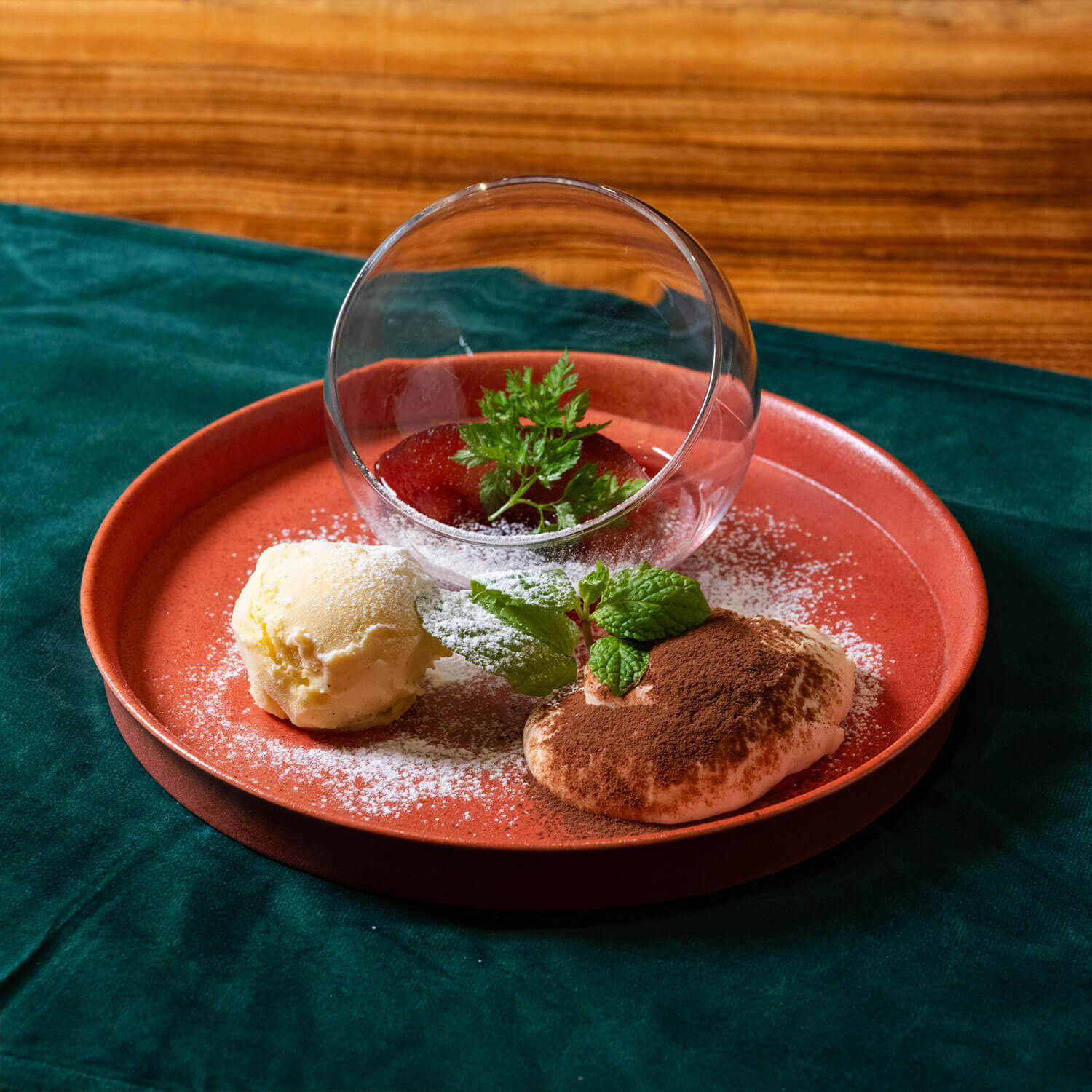 なめらかな口当たりのティラミスに、やさしい甘さの林檎のコンポートを添えたデザートプレート。アイスクリームとともに、ほどよい酸味と甘みの調和を楽しんで。