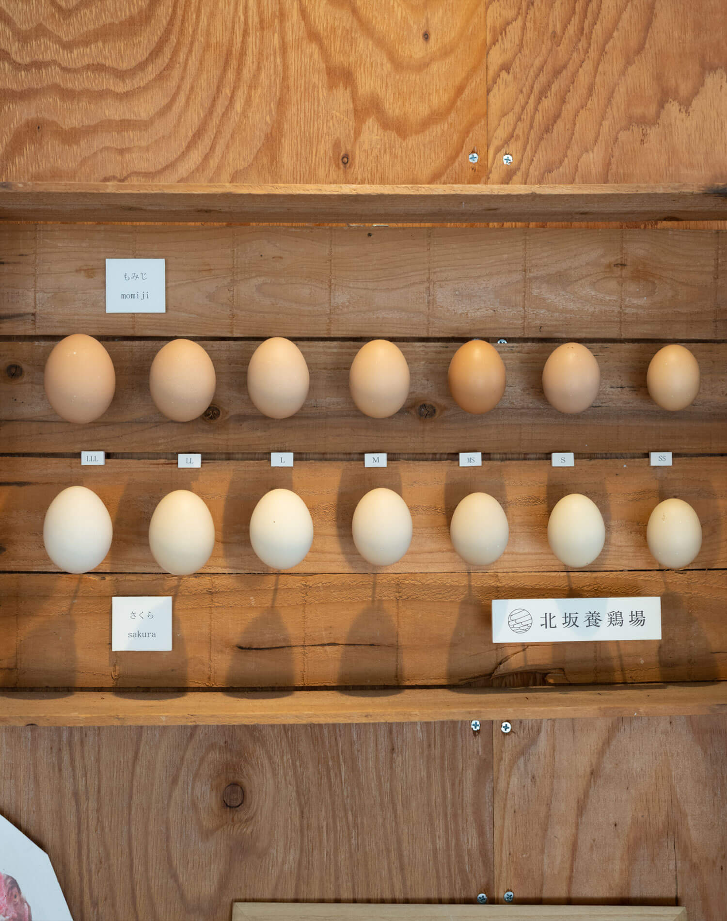 そんな『北坂養鶏場』の直売所にはもちろん、採れたてのたまごがずらり。品種ごとのサイズ展示もあって、ただたまごを買うだけではなく、選んで楽しい、見て楽しい店内に。