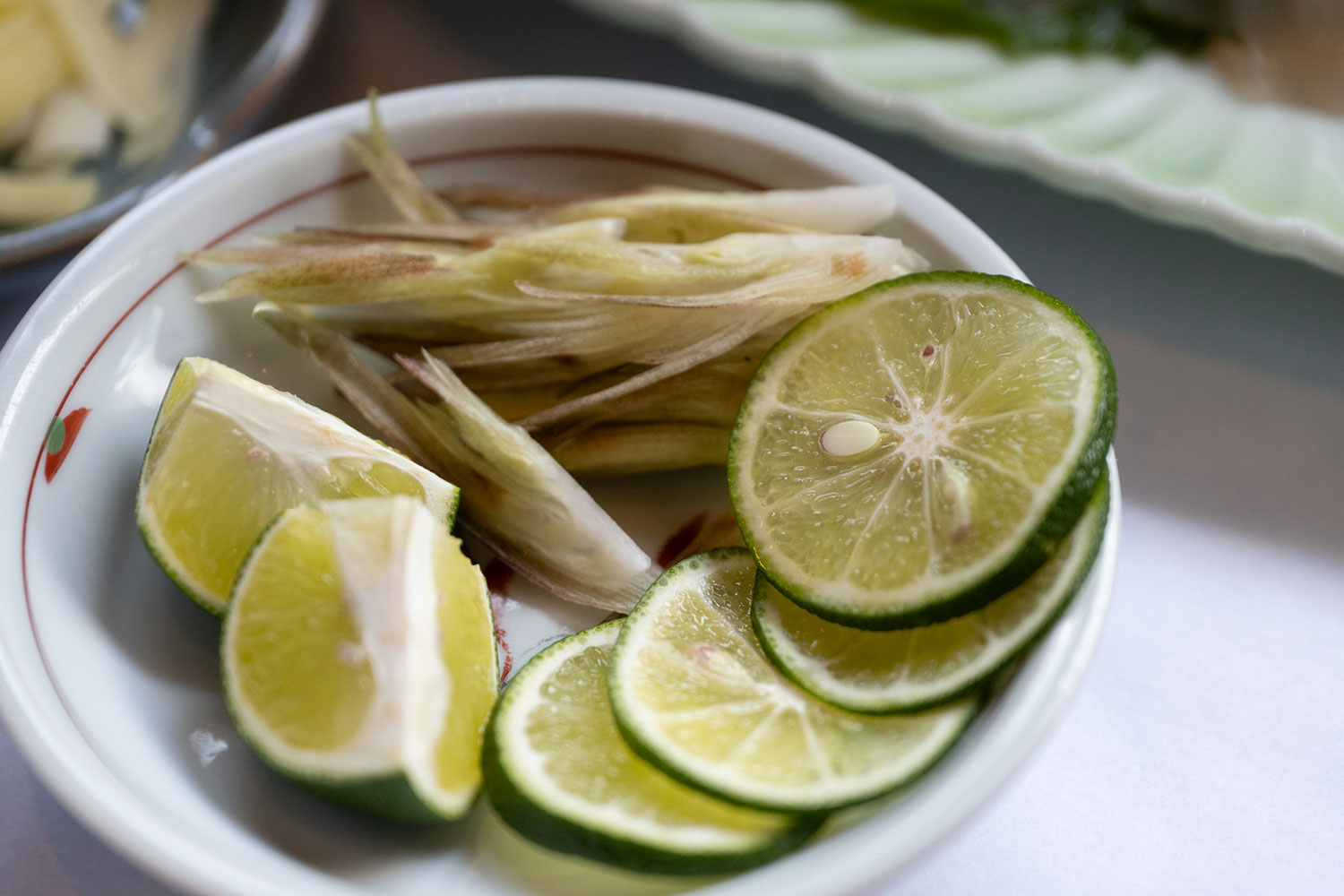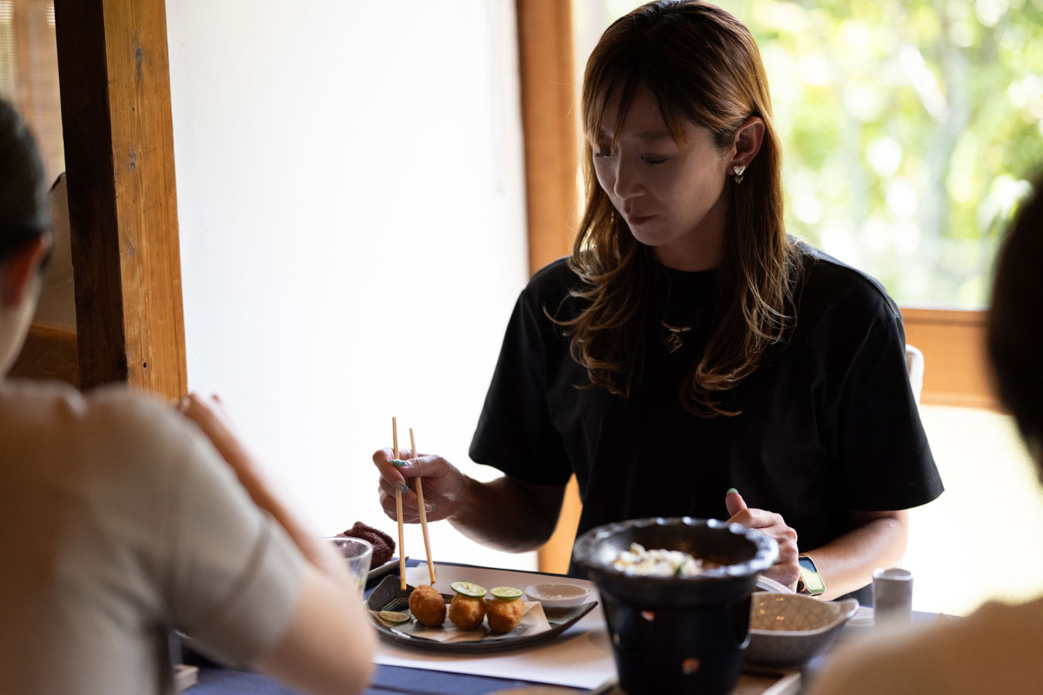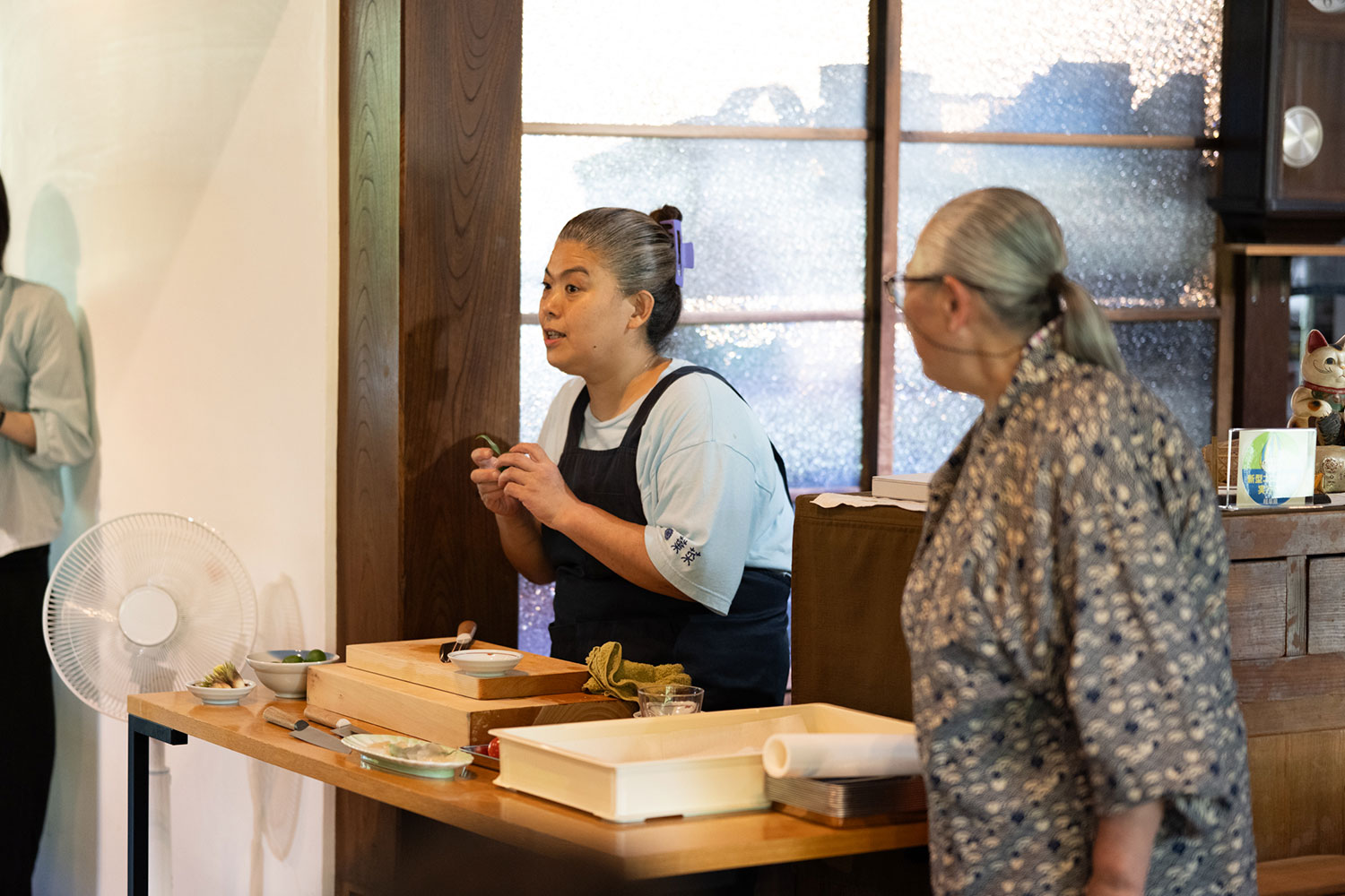 会の冒頭は、『葉菜』の店主・水谷さんと一緒に庭へ。敷地内の庭で育てた食材を収穫しながら、自然と笑顔がこぼれる時間が流れます。イワイダもすだちをチョキンと収穫。素材はこの後の調理で使用されるため、その眼差しも真剣。包丁の良さだけでなく、素材から触れてもらうことで、土地の豊かな食文化を体験します。