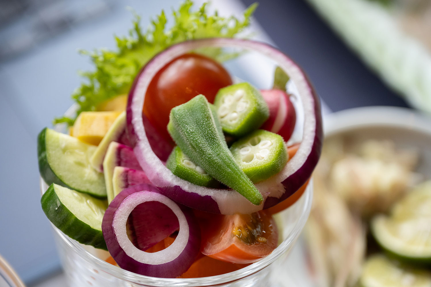 切った野菜は器に彩りよく盛り付け。みょうが、ズッキーニ、トマト、オクラなどの新鮮野菜が鮮やかに並び、包丁の切れ味が視覚的にも伝わるひと皿が完成。