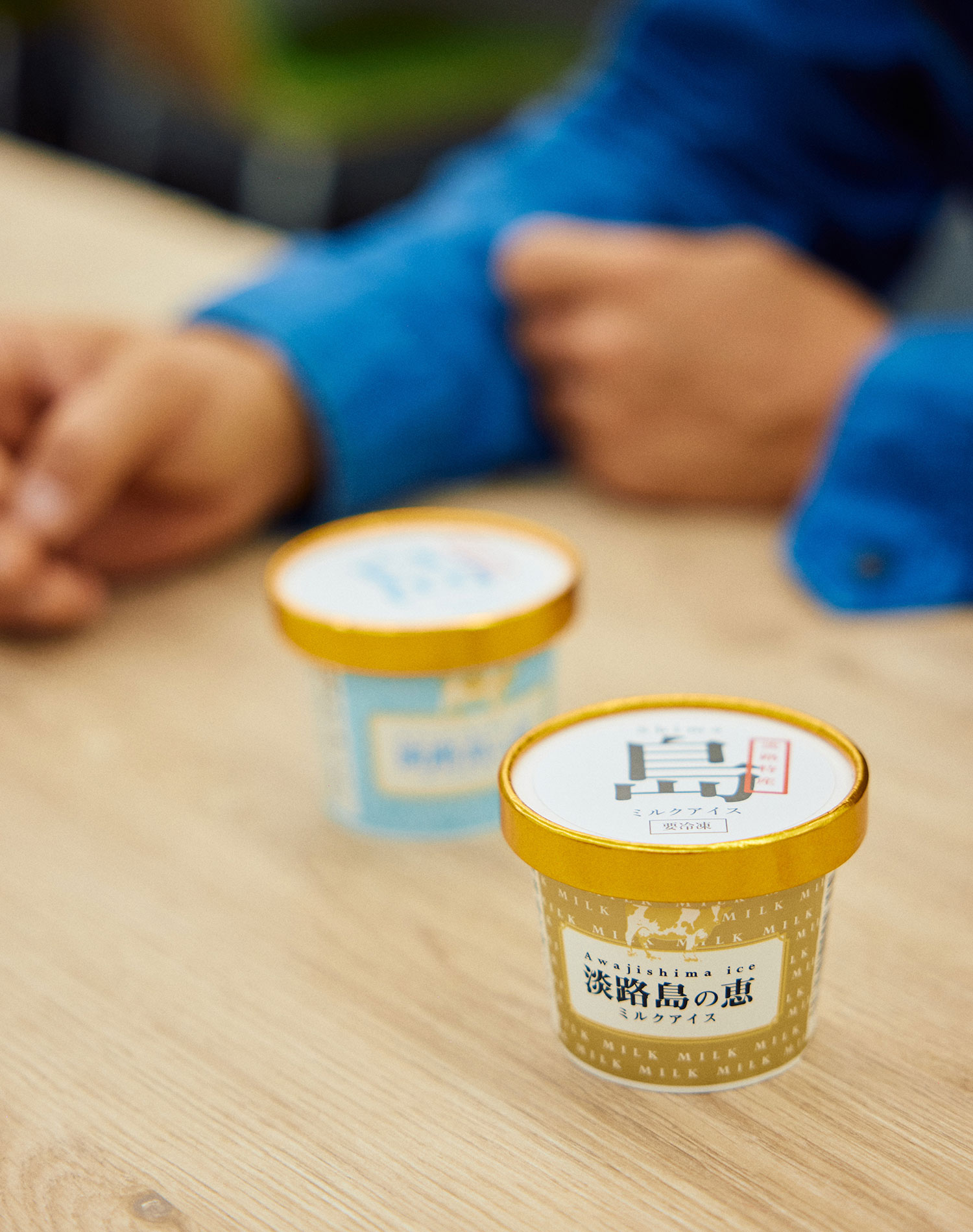 「実はこれは、基本的に業務用がメインの商品なんです。飲食店のデザート向けに、淡路島のご当地グルメとして提案できるように開発しました。味は、ミルクとヨーグルトの2種類。地元の牛乳と地元ののむヨーグルトを、どちらも最低50%以上使っています」。