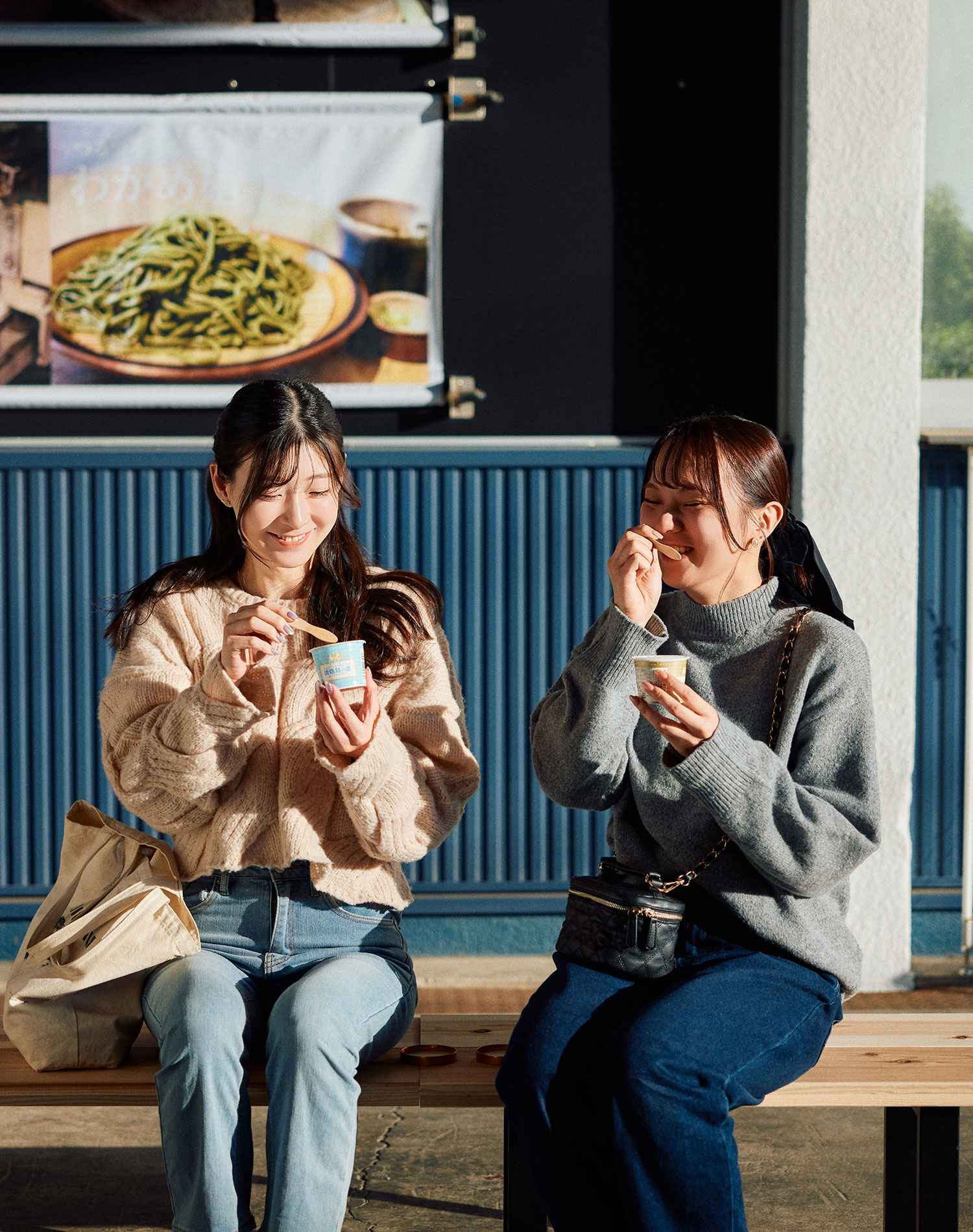 島田さんからミルクとヨーグルト、それぞれの特徴を聞いたところで、女子2人の実食タイム。直売所の外のベンチに腰かけ、2人でカップを開けて食べ比べていきます。