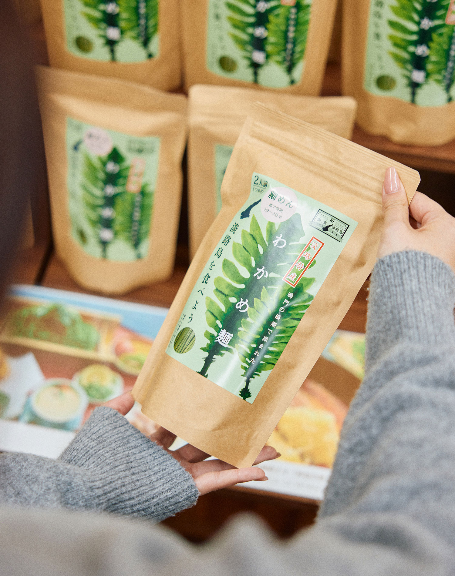 続いてお話は、『井上商店』の真骨頂ともいえる主役商品、〈わかめ麺〉へ。聞けば3代に渡り60年もの時間を要して完成したという肝いりの商品ですが、中でも島田さんが強調するのは、わかめの入れ方です。