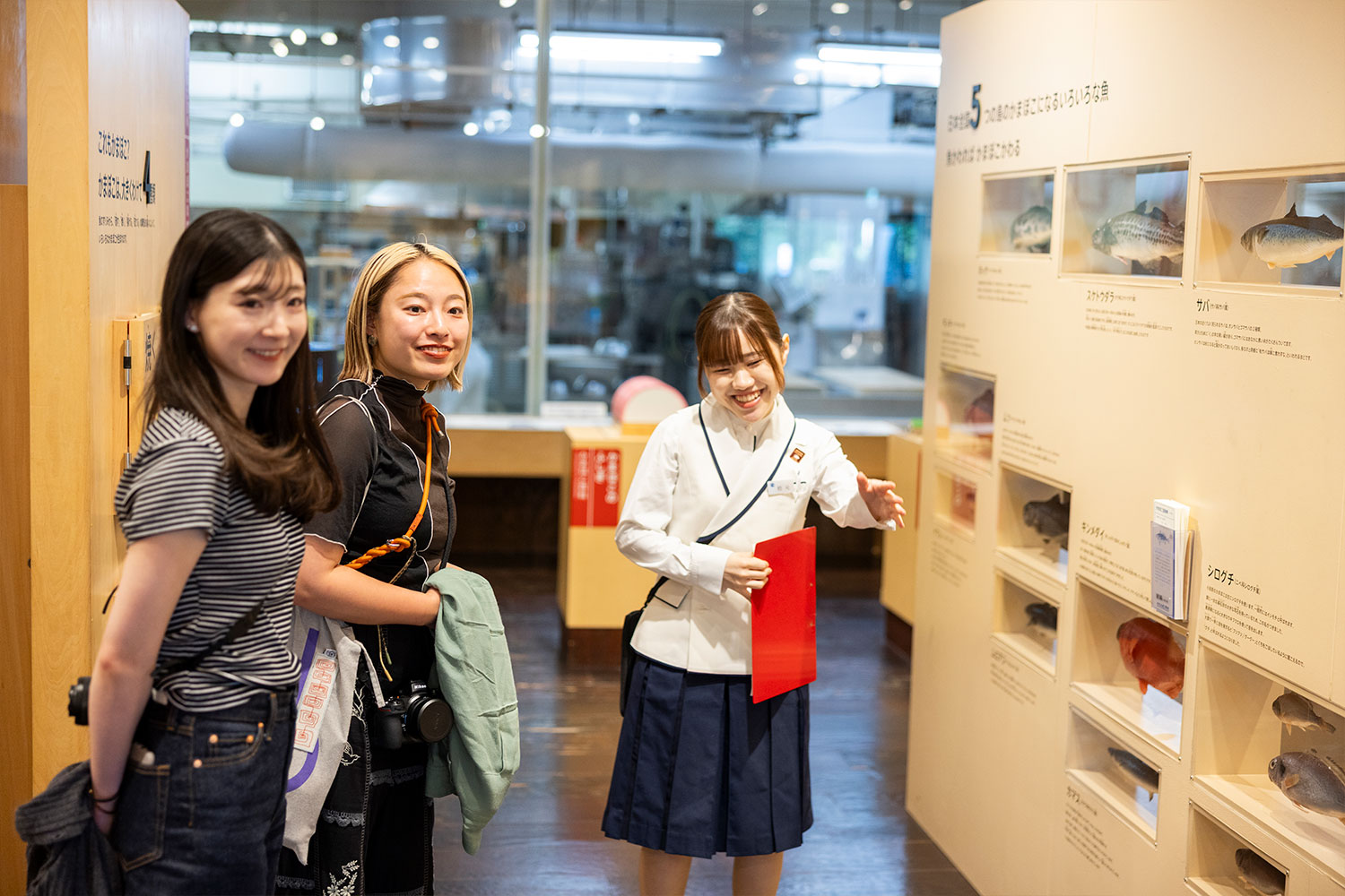 揚げかまぼこ作りの前に、館内1階の博物館スペースをチェック。かまぼこの基本情報や歴史、原料となる魚のこと、そして製法まで。工程に沿って学べるギミック満載の展示の数々に、女子2人も興味津々。