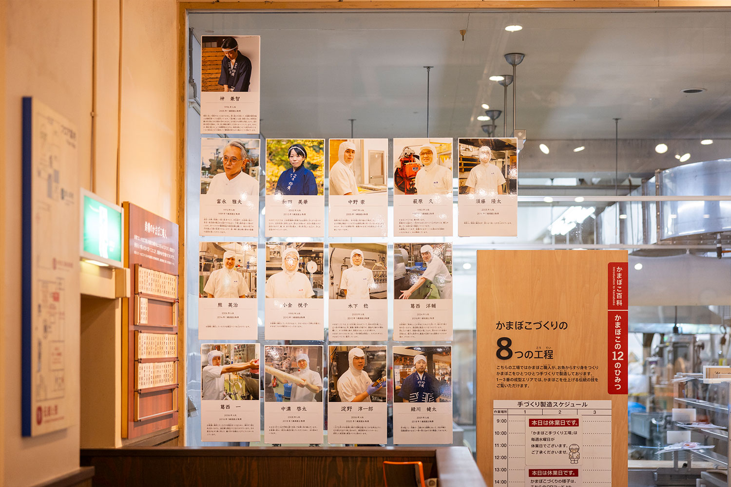 なお松元さんによると『鈴廣かまぼこ』には、水産練り製品製造技能士(1級=国家資格/2級=県資格)を持つ職人さんが、両級あわせて50人以上在籍しているそうで、これはなんと業界でも最多だとか。工場見学スペースにはそんな職人さんたちの顔写真も貼り出し、生産者の見える化を実施しています。