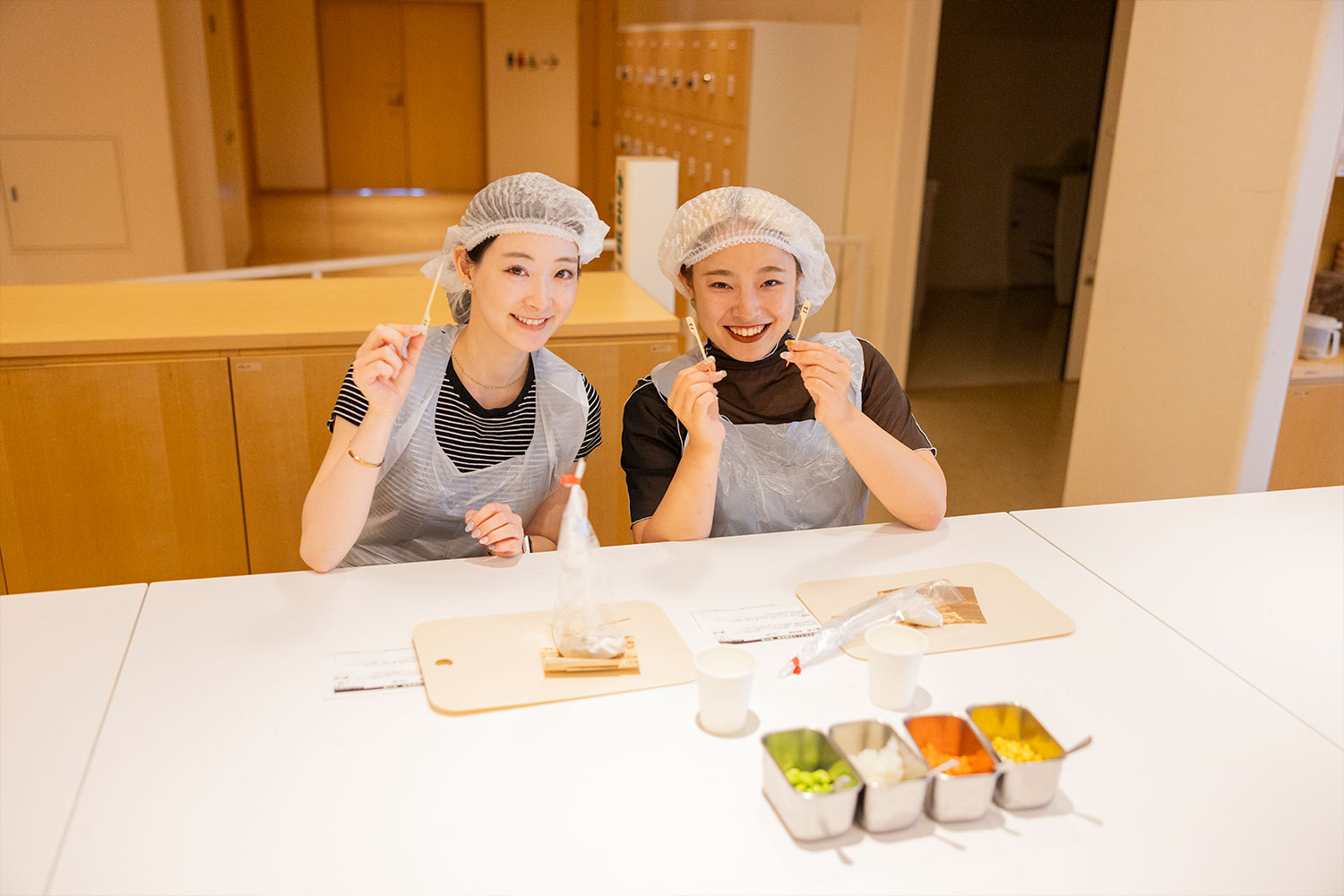 そんなこんなで、いよいよ揚げかまぼこ作りへ。受付を済ませたら、ヘアキャップとエプロンを着用。手元を整えて準備完了です。テーブルの上には、すり身と具材が小分けでスタンバイ。見るだけだった博物館が、一気に自分ごとに変わっていきます。「うまくできるかな?」なんて言いながらも、ものづくりが好きな2人はワクワク顔。