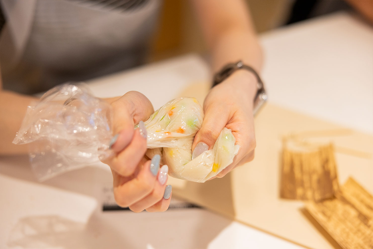 具材をしっかり混ぜたら、竹皮の上にタネを絞り出し。あとは手を水でしっかり濡らしながら、厚みを整えて形づくっていきます。