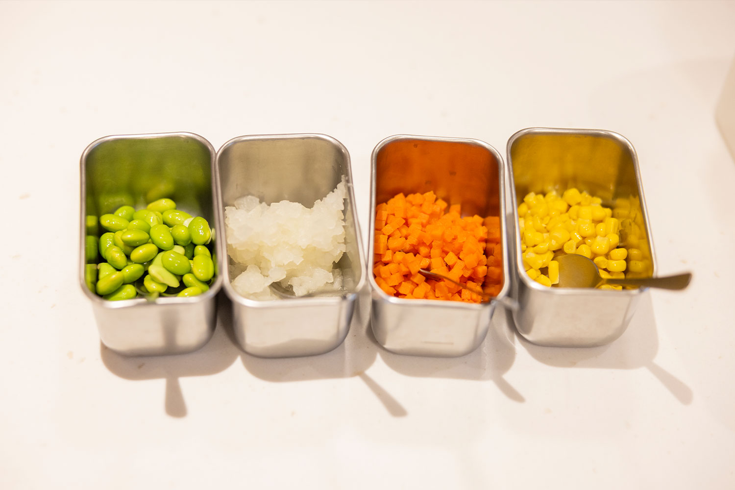 まずは、袋の中ですり身パウダーと水を混ぜてタネ作り。続いて枝豆・にんじん・コーン・玉ねぎなどの具材を好みで加え、全体をよく揉んでなじませます。混ぜ込むほど弾力が出るそう。