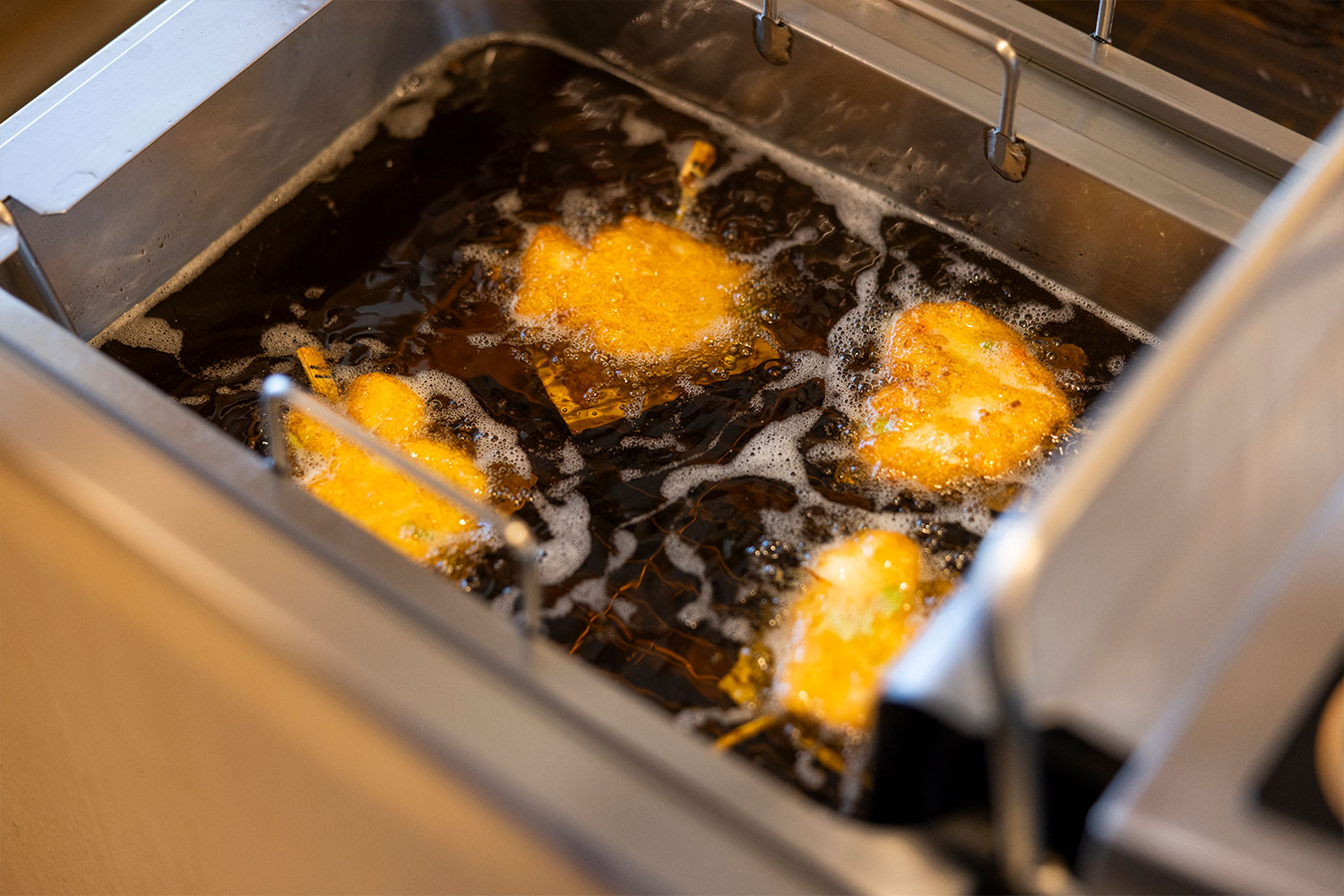 成形したら、竹串を刺してスタッフさんへバトンタッチ。専用のフライヤーを使用して、米油で2分半ほど揚げていきます。