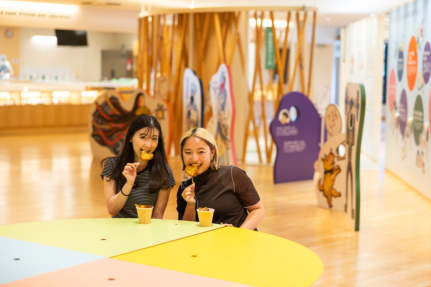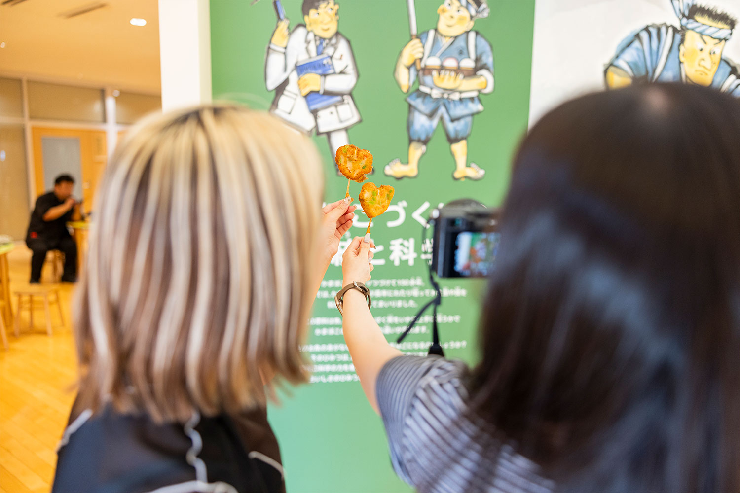 実食は、体験教室外のフリースペースで。「いただきま〜す!」と揚げたてを頬張れば、香ばしさとふわっとした食感がダイレクトに。