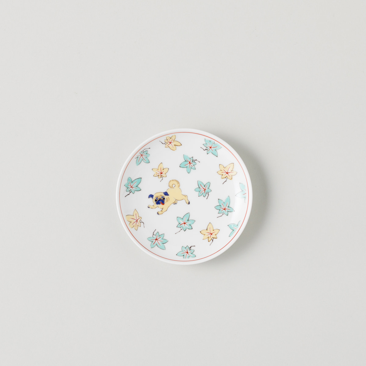 延命長寿の象徴の動物であり、秋の風情を表す柄として古くより様々な工芸品に用いられてきた「鹿紅葉文」。躍動感ある鹿の文様の中で、楽しそうにはしゃぐパグがキュート。