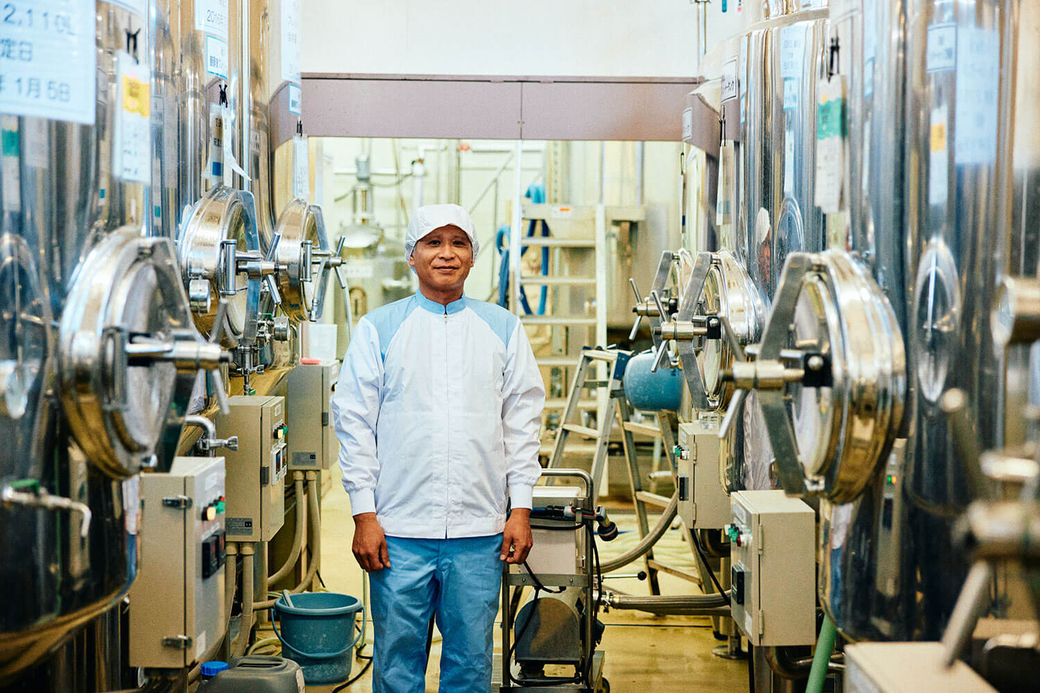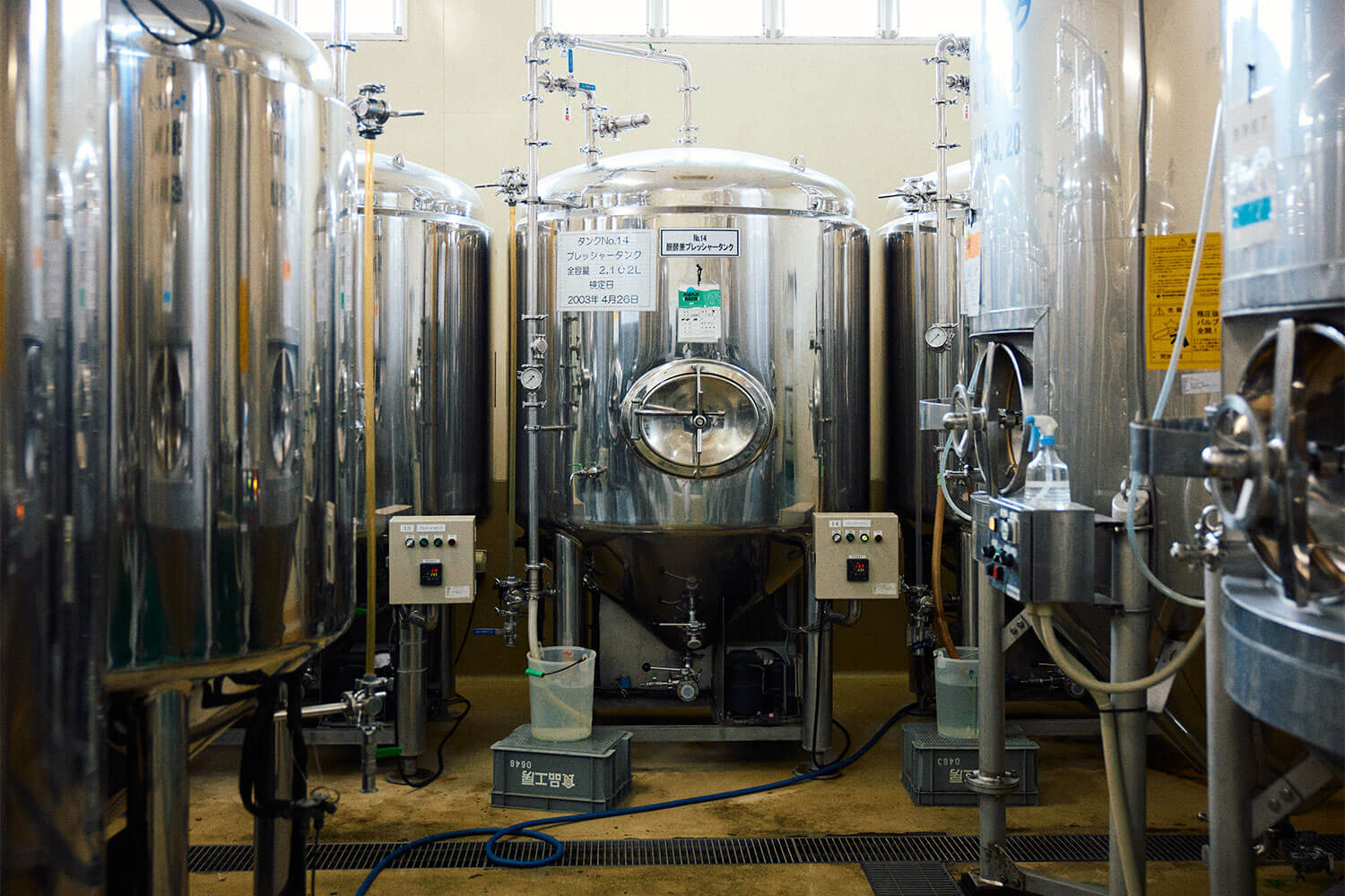 白衣とキャップを身につけエアシューターを通過したら、片山さんの案内で醸造所の中へ。ステンレスタンクがずらりと並び、配管やバルブが縦横無尽に走る風景は、まさしくプロの現場。さっきまでのほんわか旅モードから一転、ピリッと気持ちも切り替わります。