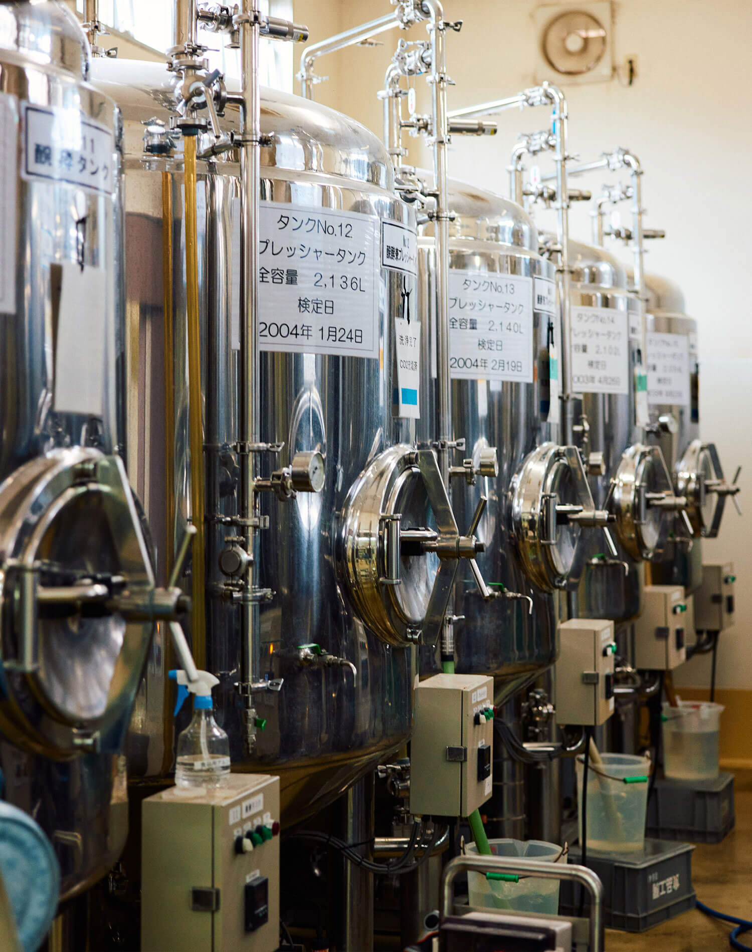 そんな『淡路ビール』の心臓が、こちらのずらりと並ぶ発酵タンク。片山さんによると、工場内には計14基のタンクがあり、定番7銘柄に季節モノを組み合わせながら、ローテーションを組みつつ日々仕込みを回しているとか。
